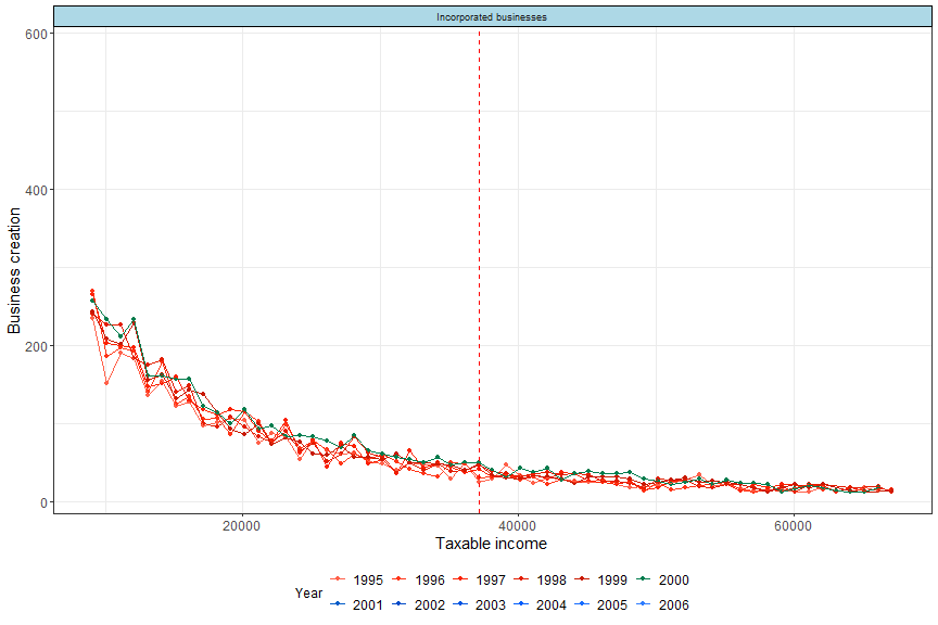 Business creation by taxable income, across years (pre-reform in red, post-reform in blue)
