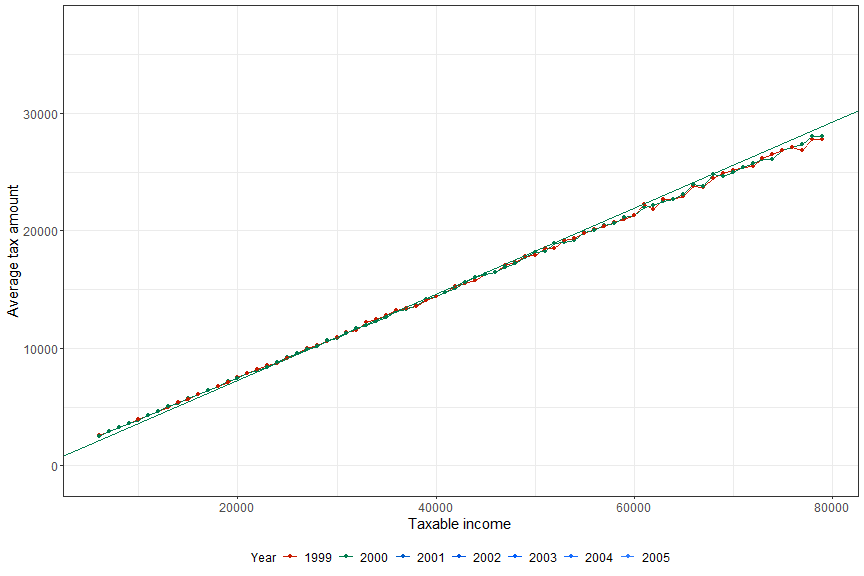 Firms’ reported tax amount (dotted) and true tax code (plain) before and after the reforms (2001-2002)